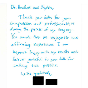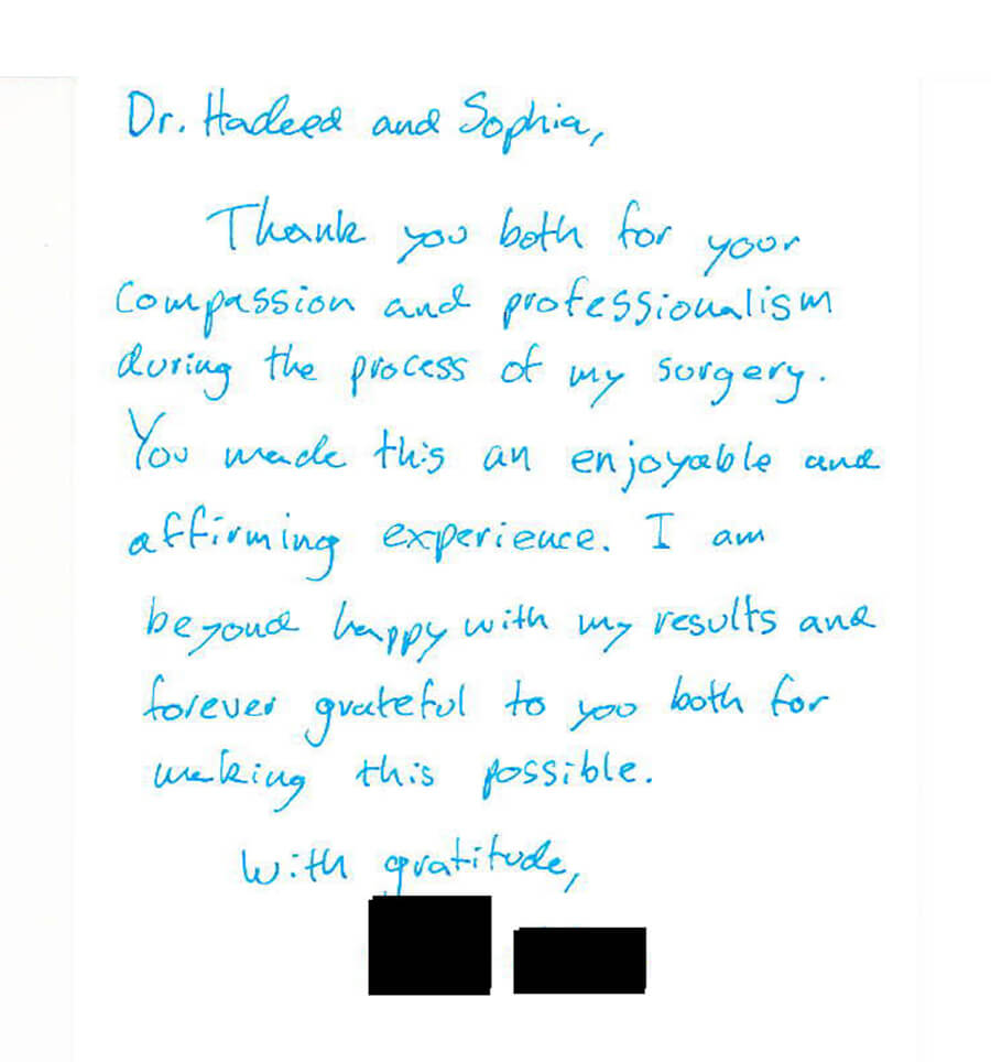 I don’t have a great deal of experience with surgeons as the only previous surgery I’ve had was an appendectomy – and that doctor I did not get to choose. Because of this I was very scared and pretty much lost when it came to finding a surgeon for my top surgery (double incision with free nipple graft). I sent out a few inquiries to different offices around the LA area. Most of the places replied back but the reply from Nicole from Dr. Hadeed’s office stood out the most. I was planning on following up with all of them but once I got into the office and met Dr. Hadeed I knew I didn’t need to do that.